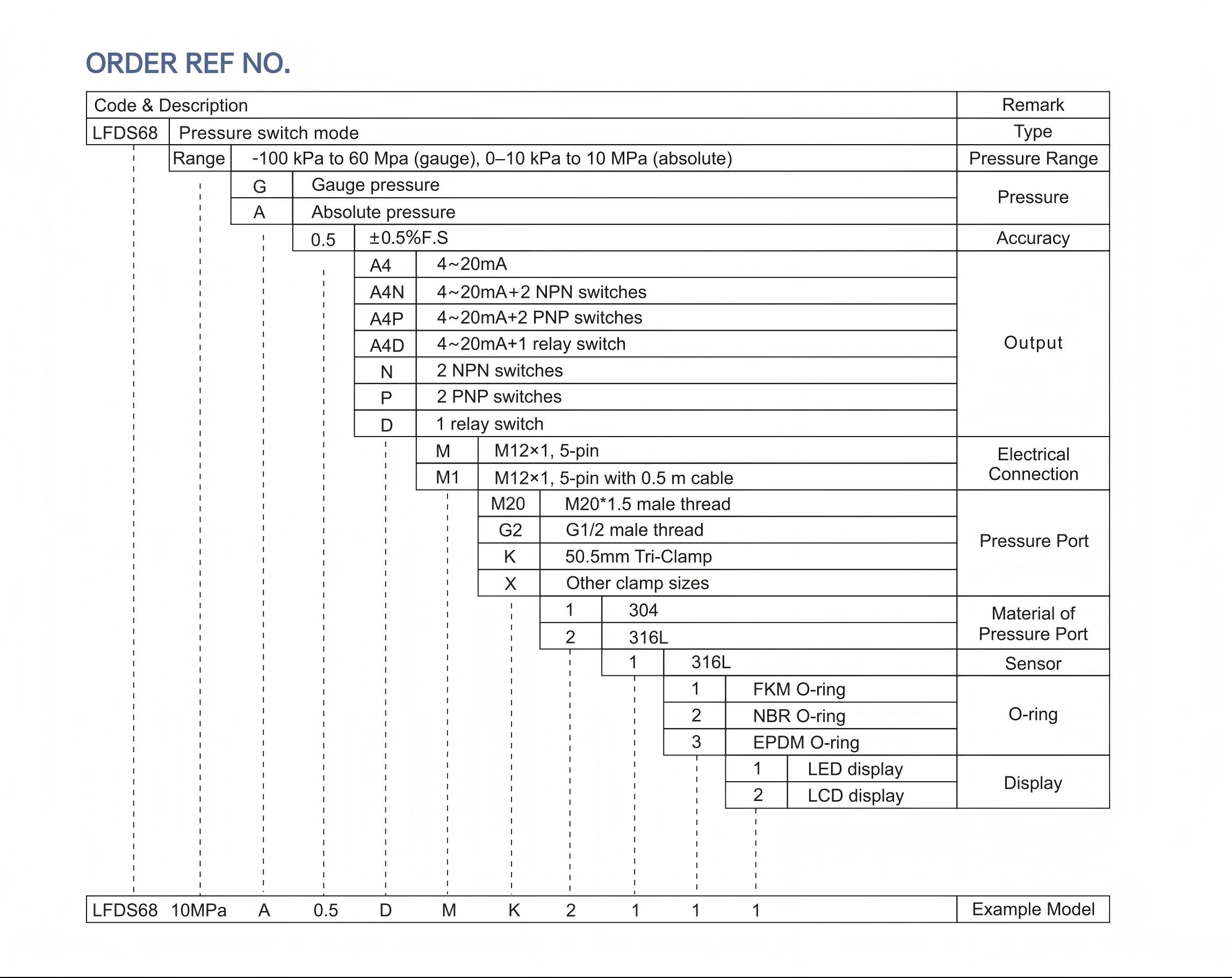 LFDS68 Pressure Switch is a fully electronic device, it uses a high-precision, high-stability silicon piezoresistive sensor with a dedicated signal conditioning circuit. It features on-site digital display, one channel 4-20 mA analog output, two channel electronic switch outputs or one relay switch output and multiple pressure connection options threaded or Tri-Clamp. This compact device integrates pressure measurement, display, output, and control. it is flexible, easy to operate, safe and reliable, widely used in: industrial automation: environmental protection petrochemical industry; water treatment systems.