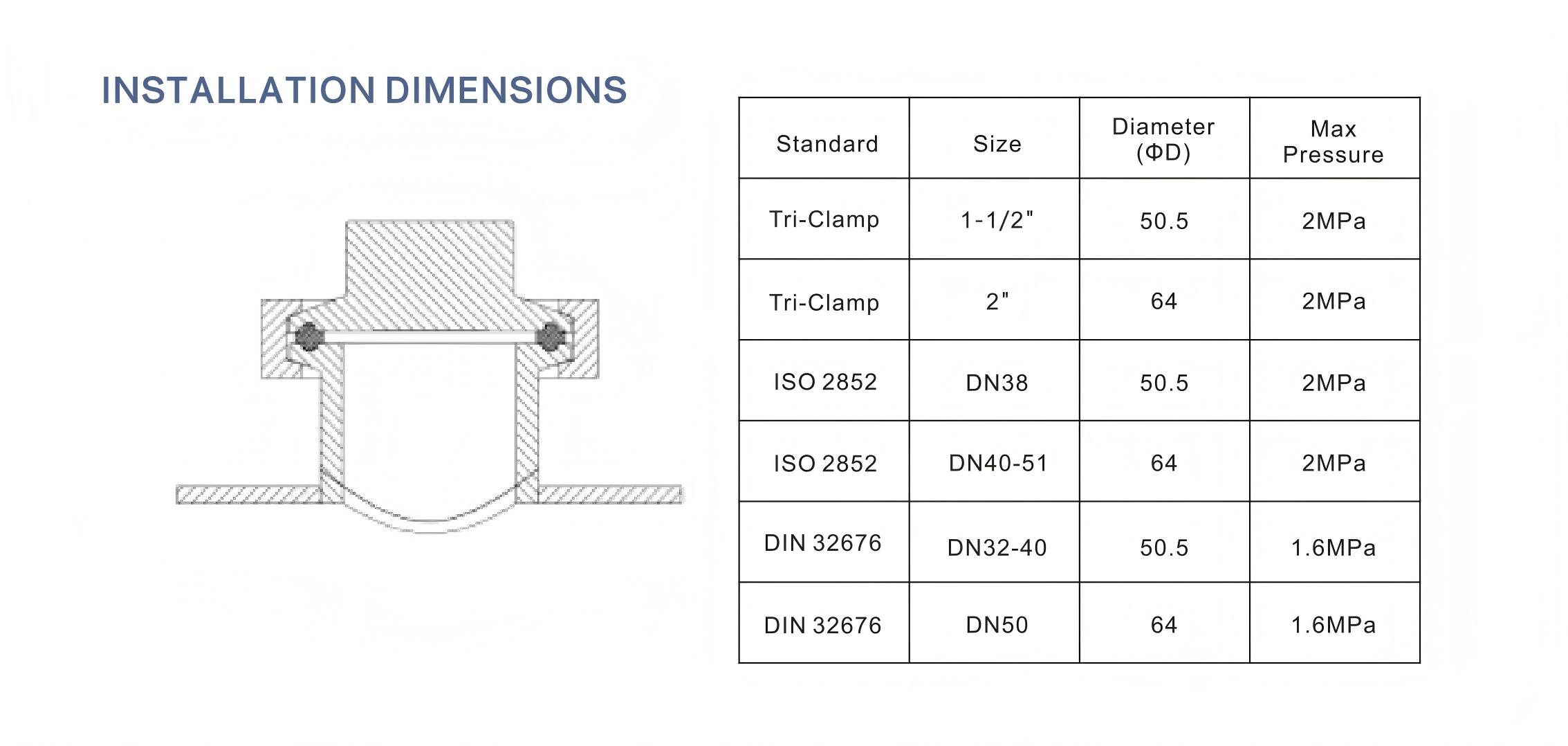 | Remark: max 2 Mpa for Tri-Clamp, as per "Pressure Connection" | |