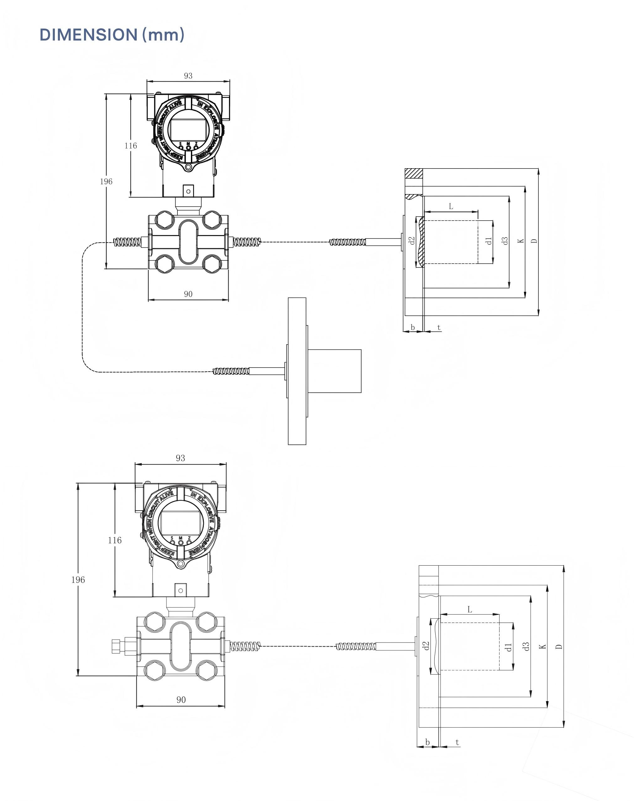 LFT720B Double Flange-mounted Differential Pressure Transmitter is composed of the LFT710 Differential Pressure Transmitter and a small welded remote flange with a capillary tube. Between the flange and the sensor, silicon oil and other filing fluids are used to transmit pressure, to prevent the measured medium from passing through the impulse pipe. Which will impact the measurement. The impact of the measured medium pass through the impulse pipe includes crystallization, solidification vaporization (boiling), condensation fractionation (severe change) and etc. The Transmitter is used to measure the liquid level, flow and pressure of liquid, gas or steam, and then convert it into 4~20 mA signal output. The working principle of LFT720B Double Flange-mounted Differential Pressure Transducer is the same as LFT710 Differential Pressure Transmitter except that the pressure transmission path on the positive pressure side is slightly different, that is the pressure acting on the high- pressure side firstly passes through the diaphragm and the filing liquid of the remote flange, and then pass to the transmitter body via capillary tube, and finally reach the high pressure side of measurement sensor.